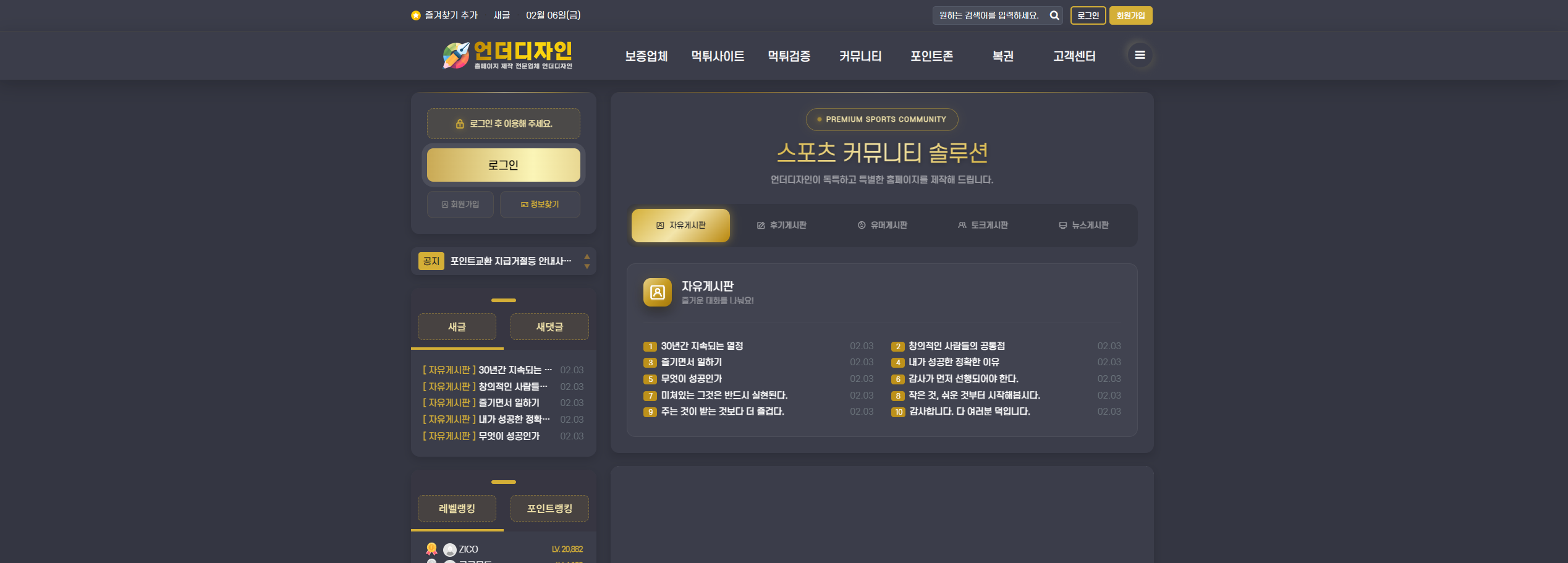 스포츠 커뮤니티 골드 솔루션 M 언더디자인 0 2 2시간전 스포츠 커뮤니티 골드 버전으로 제작된 풀반응형 솔루션 입니다.PC와 모바일에 최적화 되어 있으며, 게시판 별로 타입에 맞는 스킨이 제공 됩니다.그외 따로 원하는 게시판은 의뢰를 통하여 제작이 가능합니다.언더디자인. 스포츠 커뮤니티, 먹튀검증 커뮤니티, 토토 커뮤니티, 슬롯 커뮤니티, 카지노 커뮤니티 Author 0 0 Lv.15 M 언더디자인 최고관리자 24,350 (52%) 등록된 서명이 없습니다.